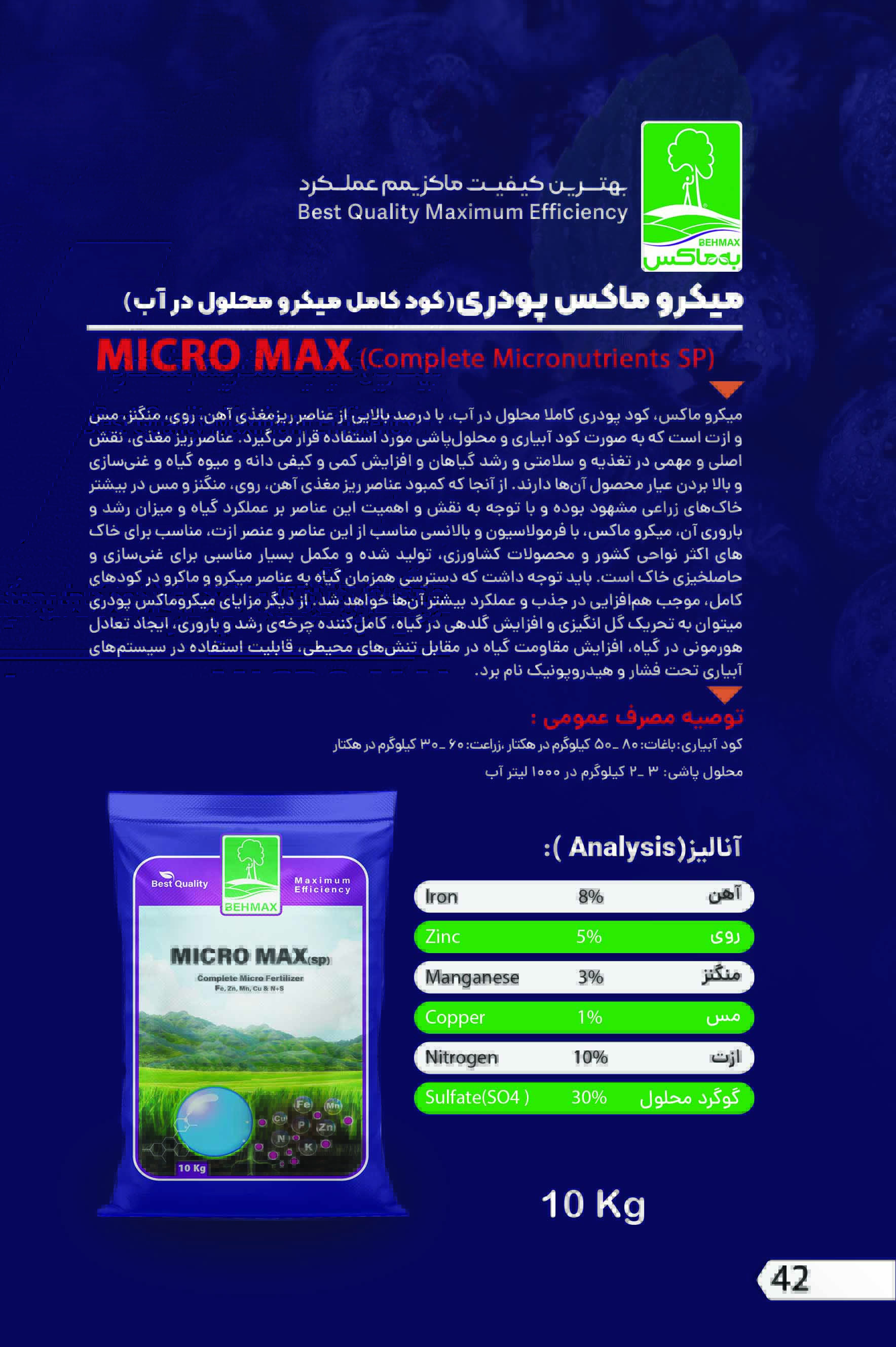 | معرفی محصول | میکرو ماکس، کود پودری کاملا محلول در آب، با درصد بالایی از عناصر ریزمغذی آهن، روی، منگنز، مس و ازت است که به صورت کود آبیاری و محلول پاشی مورد استفاده قرار می گیرد. عناصر ریز مغذی، نقش اصلی و مهمی در تغذیه و سلامتی و رشد گیاهان و افزایش کمی و کیفی دانه و میوه گیاه و غنی سازی و بالا بردن عیار محصول آنها دارند. |