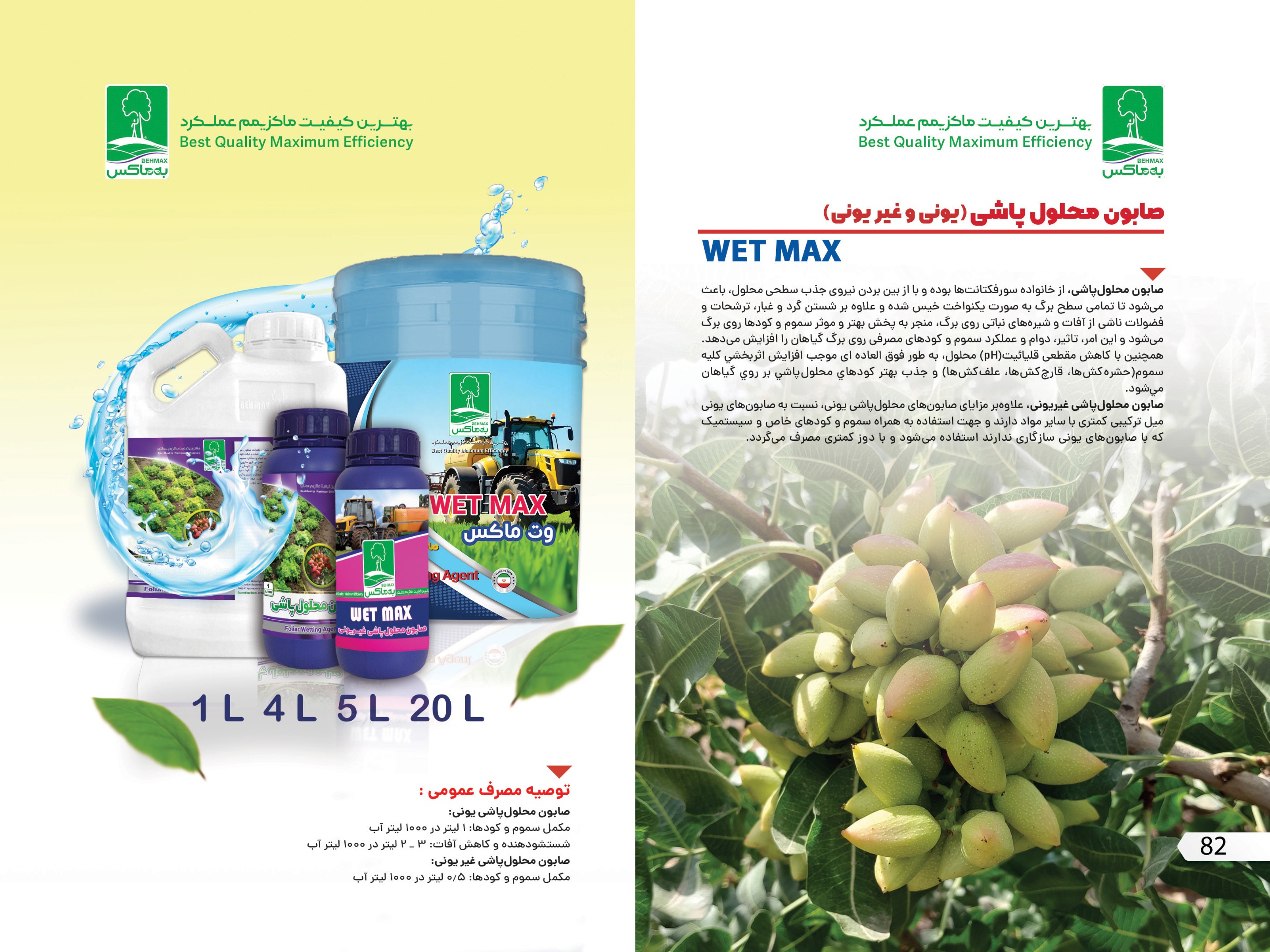 معرفی محصول | صابون محلول پاشی، در دو نوع یونی و غیریونی(WET MAX)، از خانواده سورفکتانت ها بوده که با از بین بردن نیروی جذب سطحی قطرات محلول مورد مصرف، باعث می شود تا تمامی سطح برگ ها به صورت یکنواخت خیس شده و ذرات کود و سم به خوبی روی برگ و اندام های گیاه پخش شود و این امر، تاثیر، دوام و عملکرد سموم و کودهای مصرفی روی برگ گیاهان را افزایش می دهد. محلول پاشی همراه با این صابون، سطح برگ های آلوده را کاملا شستشو داده و با بازتر کردن روزنه های برگ ها علاوه بر شستن گرد و غبار، ترشحات و فضولات ناشی از آفات و شیره های نباتی، ضمن افزایش نفوذ سم و كود مصرفی، باعث افزایش عملکرد آنها و بهبود تنفس برگ ها و اعمال فتوسنتز و کربن گیری گیاه می گردد. قطره های محلول سم یا یك كود در روی برگ همچون عدسی(ذره بین) عمل کرده و نور خورشید آن نقطه از برگ را می سوزاند. با مخلوط نمودن صابون محلول پاشـي با محلول مورد استفاده، این حالت قطره اي شدن محلول از بين رفته و قطرات به خوبی در كل سطح برگ پخش می شوند. |