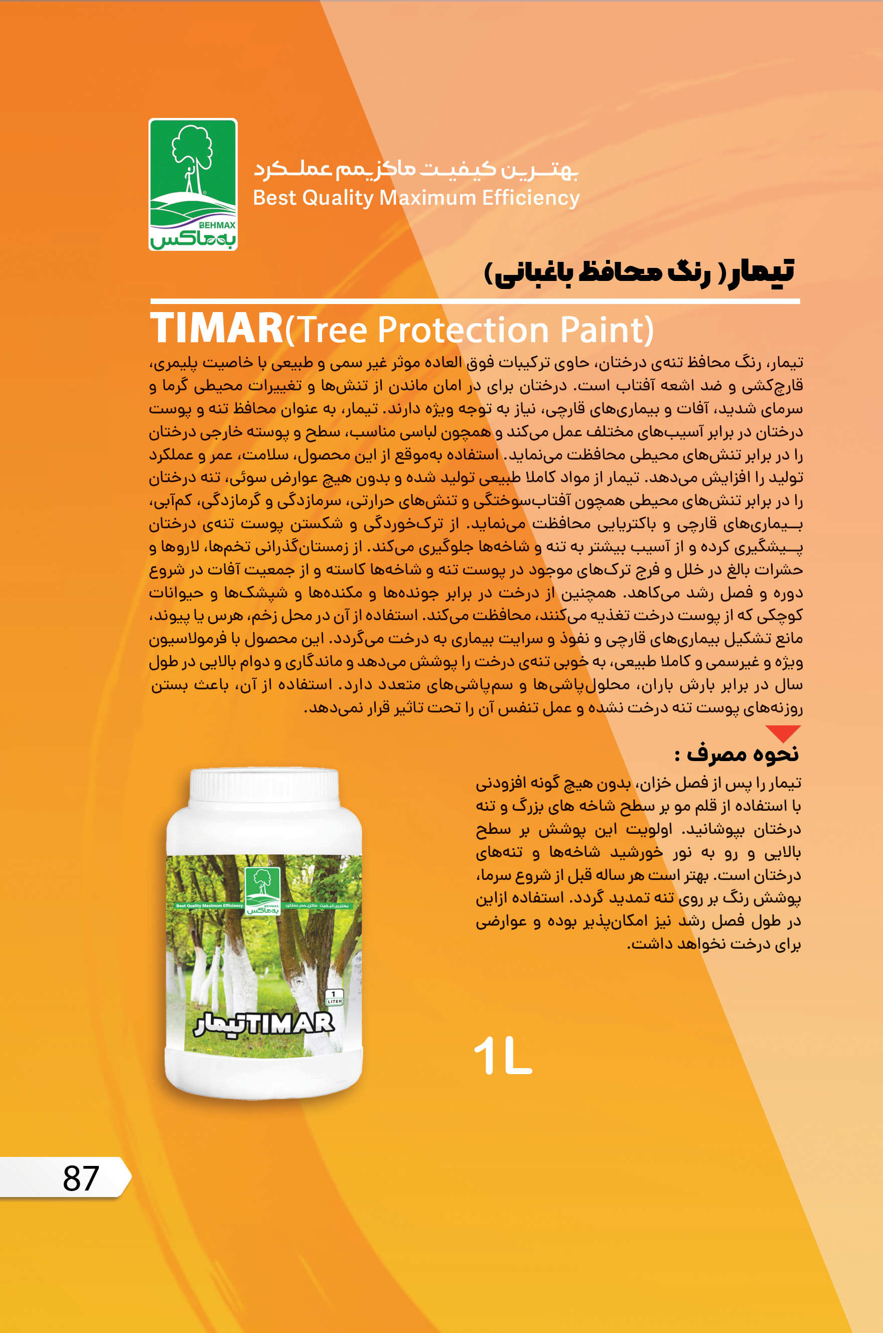 تیمار، از مواد کاملا طبیعی تولید شده و بدون هیچ عوارض سوئی، تنه درختان را در برابر تنش های محیطی همچون آفتاب سوختگی و تنش های حرارتی، سرمازدگی و گرمازدگی، کم آبی، بیماری های قارچی و باکتریایی محافظت می نماید. از ترک خوردگی و شکستن پوست تنه درختان پیشگیری کرده و از آسیب بیشتر به تنه و شاخه ها جلوگیری می کند. از زمستان گذرانی تخم ها، لاروها و حشرات بالغ در خلل و فرج ترک های موجود در پوست تنه و شاخه ها کاسته، و از جمعیت آفات در شروع دوره و فصل رشد می کاهد. همچنین از درخت در برابر جونده ها و مکنده ها و شپشک ها و حیوانات کوچکی که از پوست درخت تغذیه می کنند، محافظت می کند. استفاده از آن در محل زخم، هرس یا پیوند، مانع تشکیل بیماری های قارچی و نفوذ و سرایت بیماری به درخت می گردد. این محصول با فرمولاسیون ویژه و غیرسمی و کاملا طبیعی، به خوبی تنه ی درخت را پوشش می دهد و ماندگاری و دوام بالایی در طول سال در برابر بارش باران، محلول پاشی ها و سمپاشی های متعدد دارد. استفاده از آن، باعث بستن روزنه های پوست تنه درخت نشده و عمل تنفس آن را تحت تاثیر قرار نمی دهد. |