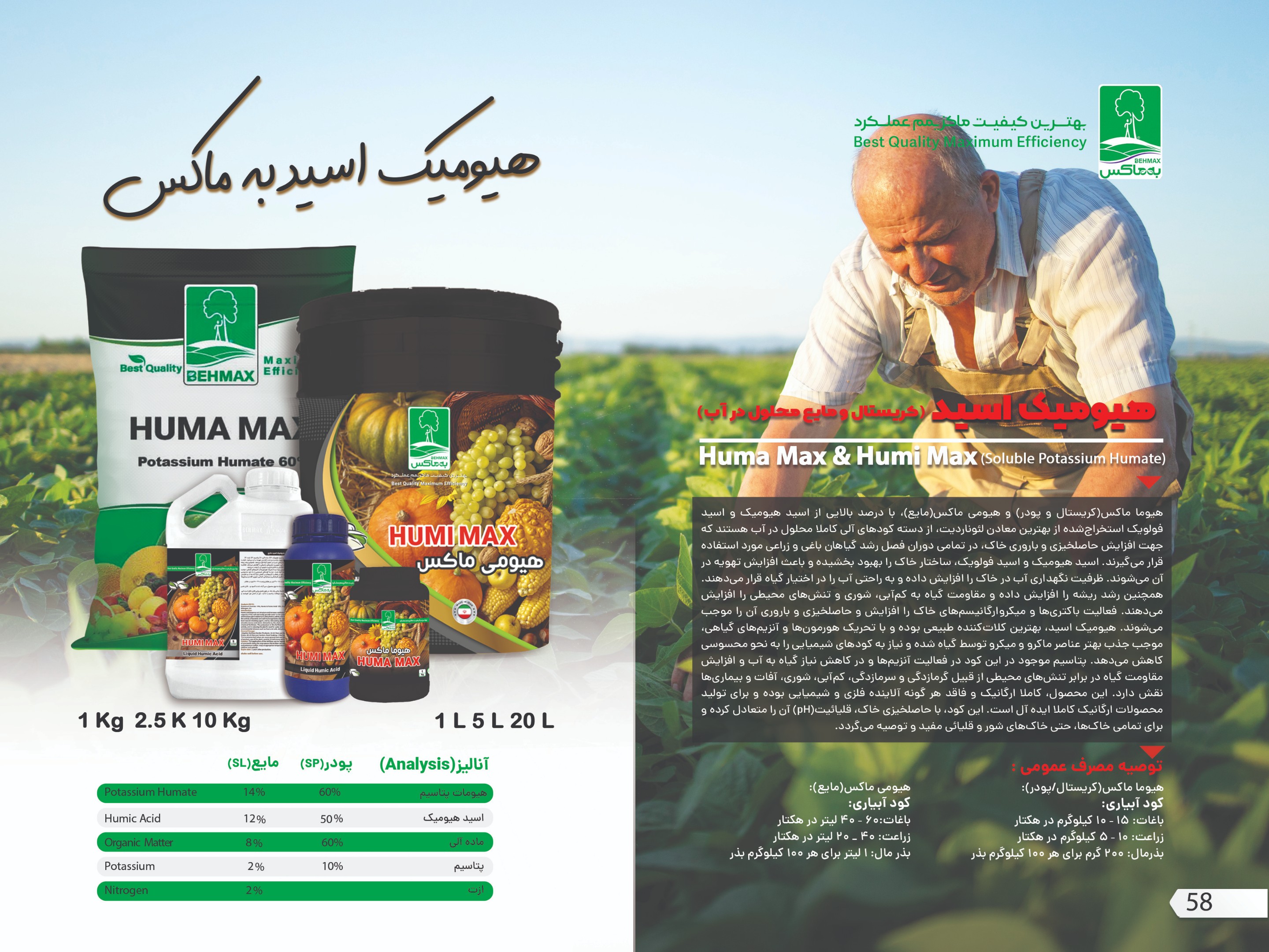 | معرفی محصول | هیوما ماکس(کریستال و پودر) و هیومی ماکس(مایع)، با درصد بالایی از اسید هیومیک و اسید فولویک استخراج شده از بهترین معادن لئوناردیت، از دسته کود های آلی کاملا محلول در آب هستند که جهت افزایش حاصلخیزی و باروری خاک، در تمامی دوران فصل رشد گیاهان باغی و زراعی مورد استفاده قرار می گیرند. |