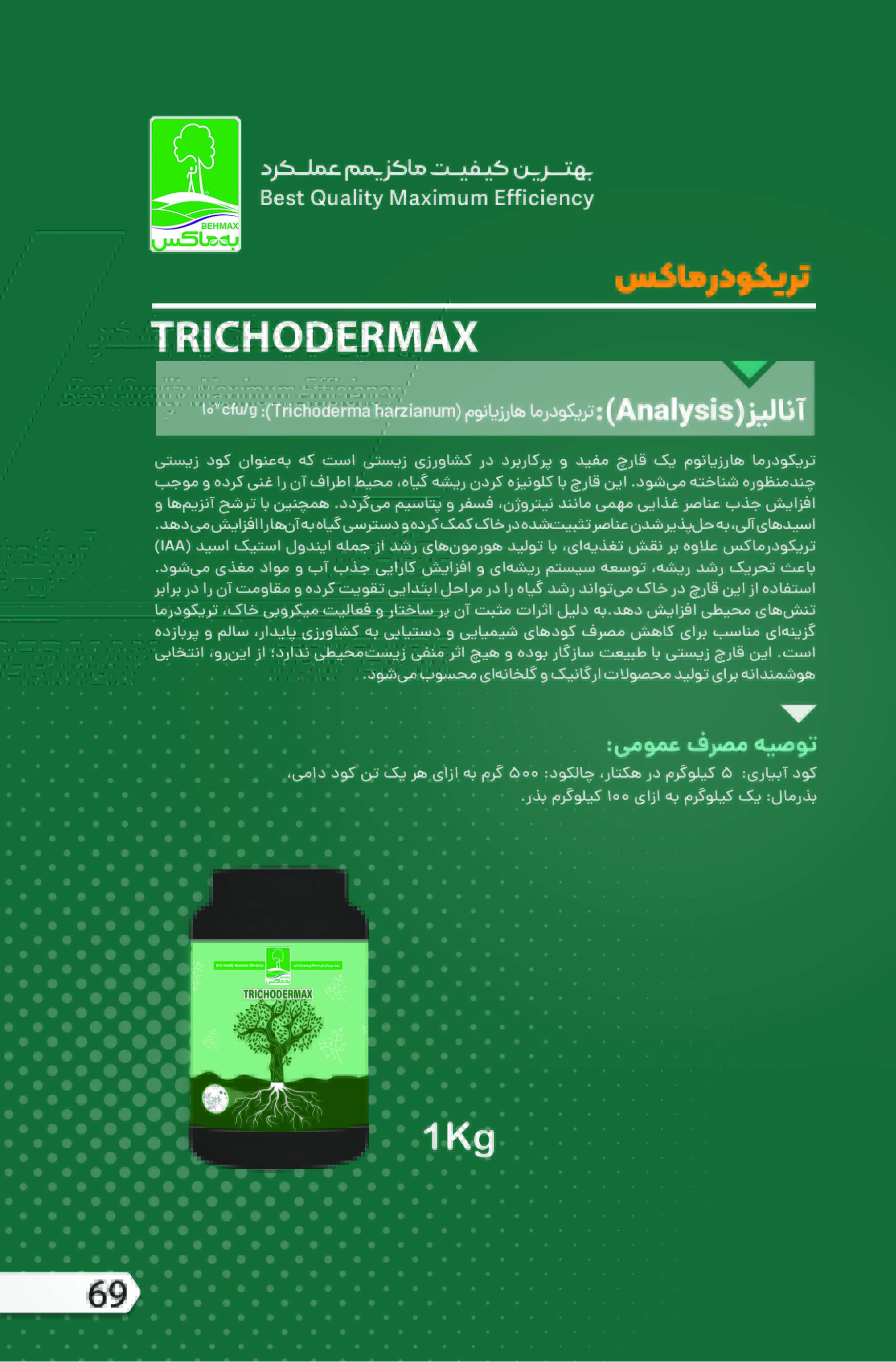 | معرفی محصول | تریکودرماکس(SP)، کود زیستی(بیولوژیک) پودری حاوی میکرو ارگانیسمهای مفید قارچ تریکودرما است. قارچ تریکودرما موجود در تریکودرماکس از خاک مناطق کشاورزی نیمه خشک ایران جداسازی شده و سازگاری بسیار بالایی با شرایط آب و هوایی گرم و خشک و آب و خاک شور و قلیایی دارد. تریکودرماکس، سرعت رشد و گسترش ریشه گیاه را افزایش می دهد. همچنین با افزایش حلالیت و کلات کردن عناصر ماکرو و میکرو موجود در ریزوسفر خاک، جذب آنها را توسط گیاه افزایش می دهد. این محصول همچنین با سازگاری و مکملسازی لازم با گیاه، موجب جذب بهتر عناصر نیتروژن و پتاسیم می گردد. استفاده از این محصول کاملا ارگانیک، موجب اصلاح ساختار فیزیکی و شیمیایی و حاصلخیزی خاک، سلامت گیاه، کیفیت و کمیت محصولات کشاورزی می گردد. |