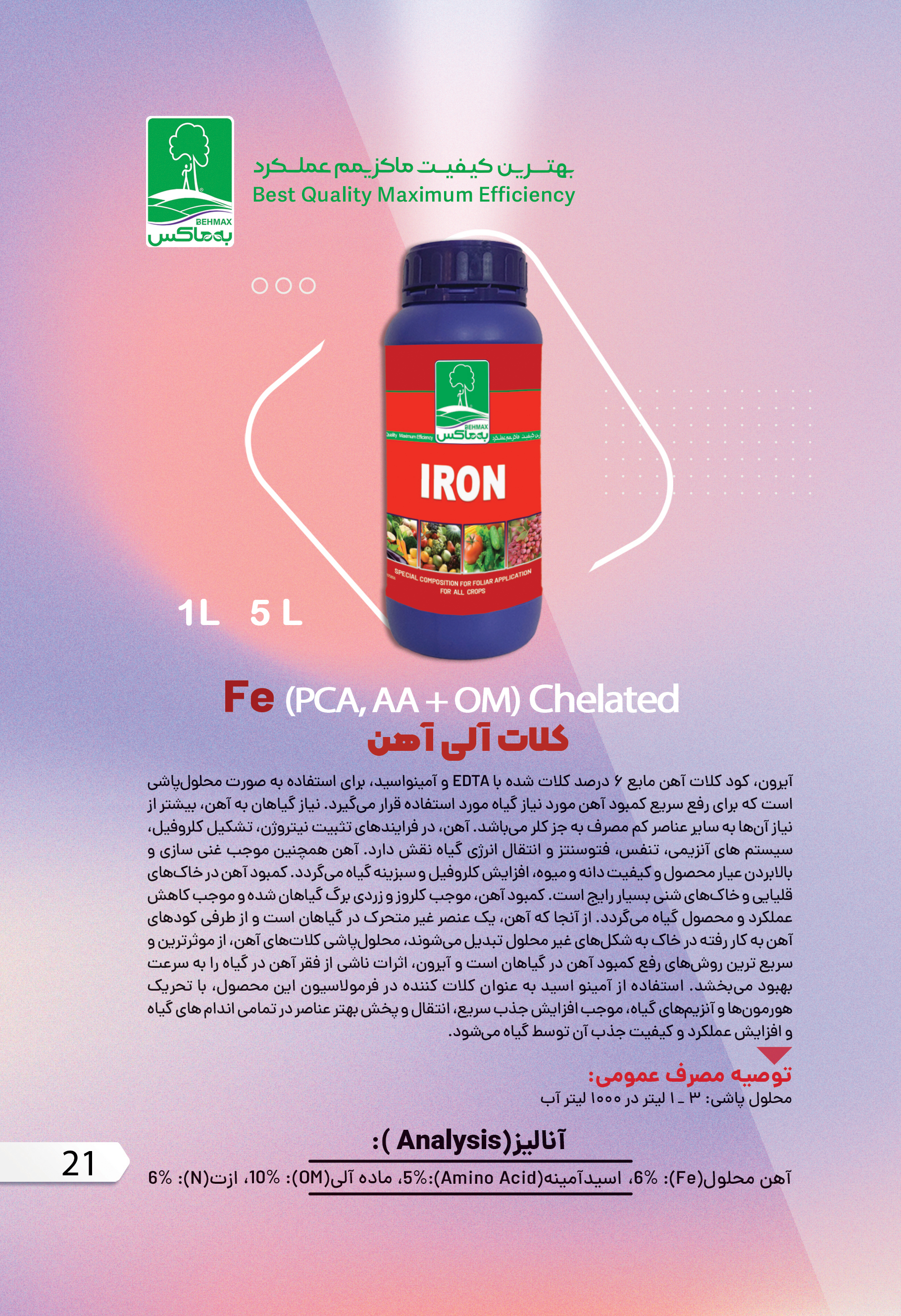 معرفی محصول | آیرون، کود کلات آهن مایع 6 درصد کلات شده با EDTA و آمینواسید، برای استفاده به صورت محلول پاشی است که برای رفع سریع کمبود آهن مورد نیاز گیاه مورد استفاده قرار می گیرد. نیاز گیاهان به آهن، بیشتر از نیاز آنها به سایر عناصر کم مصرف به جز کلر می باشد. آهن، در فرایندهای تثبیت نیتروژن، تشکیل کلروفیل، سیستم های آنزیمی، تنفس، فتوسنتز و انتقال انرژی گیاه نقش دارد. موجب غنی سازی و بالابردن عیار محصول و کیفیت دانه و میوه، افزایش کلروفیل و سبزینه گیاه می گردد. کمبود آهن در خاکهای قلیایی و خاک های شنی بسیار رایج است. کمبود آهن، موجب کلروز و زردبرگی گیاهان شده و موجب کاهش عملکرد و محصول گیاه می گردد. |