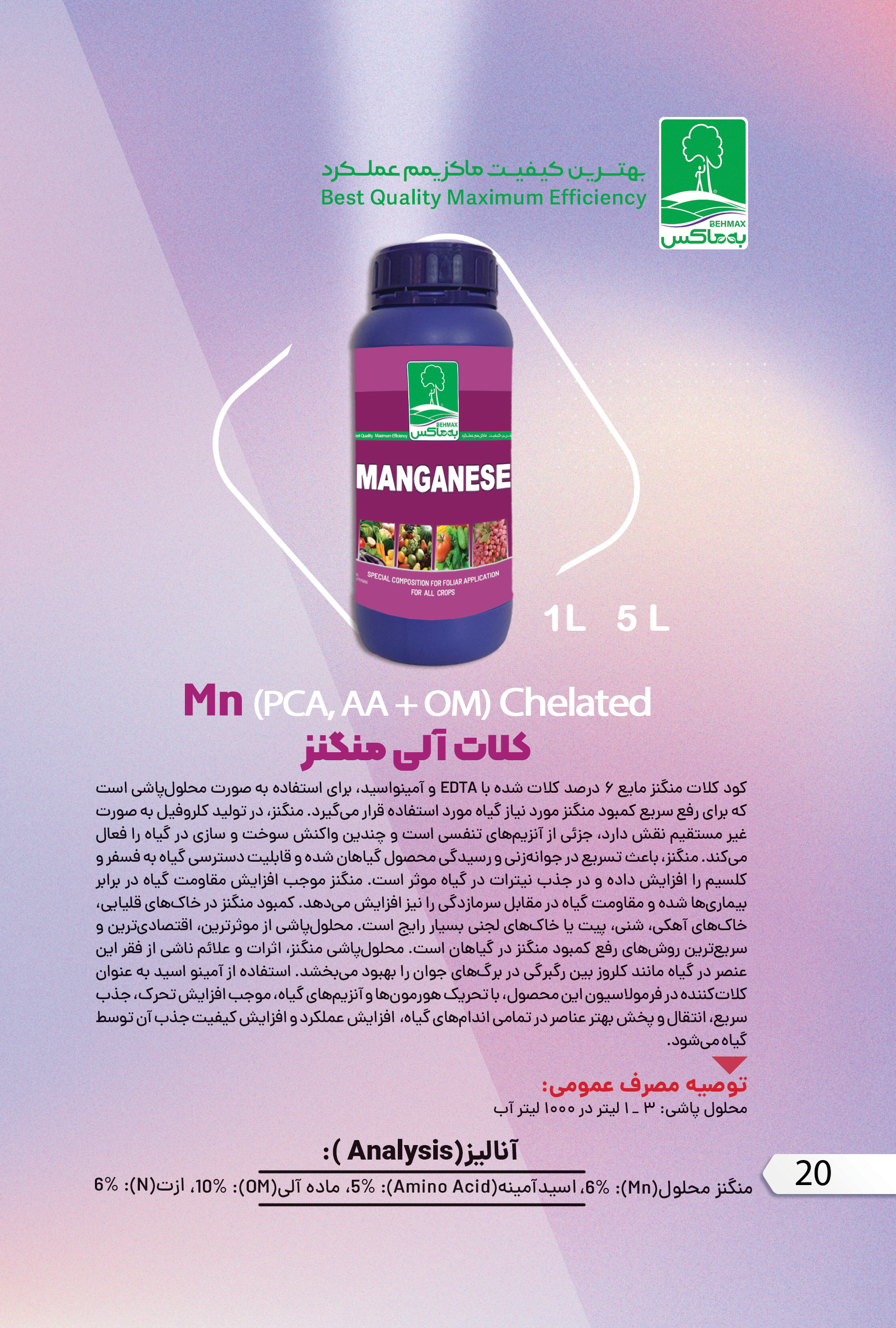 معرفی محصول | منگنز، کود کلات منگنز مایع 6 درصد کلات شده با EDTA و آمینواسید، برای استفاده به صورت محلول پاشی است که برای رفع سریع کمبود منگنز مورد نیاز گیاه مورد استفاده قرار می گیرد. منگنز، در تولید کلروفیل به صورت غیر مستقیم نقش دارد. جزئی از آنزیم های تنفسی است و چندین واکنش سوخت و سازی در گیاه را فعال می کند. منگنز، باعث تسریع در جوانه زنی و رسیدگی محصول گیاهان شده و قابلیت دسترسی گیاه به فسفر و کلسیم را افزایش داده و در جذب نیترات در گیاه موثر است. منگنز موجب افزایش مقاومت گیاه در برابر بیماری ها شده و مقاومت گیاه در مقابل سرمازدگی را افزایش می دهد. کمبود منگنز در خاک های قلیایی، خاک های آهکی، شنی، پیت یا خاک های لجنی بسیار رایج است. |