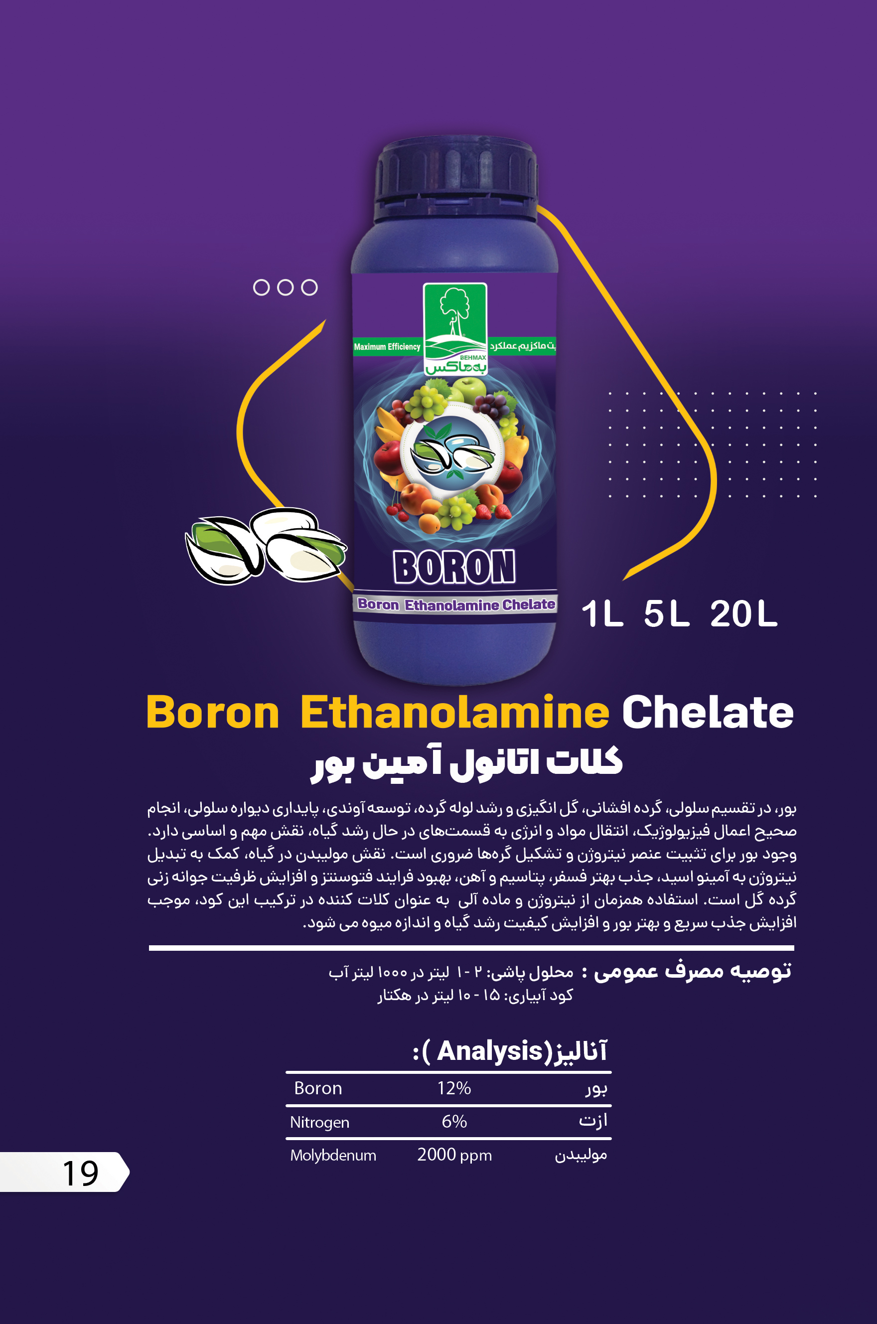 مزایای محصول | کلات بودن بور، با دی اتانول آمین به همراه استفاده از هم افزایی این عنصر با عناصر مولیبدن و ازت در فرمولاسیون تولید بورون، با تحریک هورمون ها و آنزیم های گیاهی، موجب جذب و انتقال و تاثیر سریع این محصول در سلول های اندام های گیاه می گردد. کمبود بور در مناطقی با آب و هوای خشک، خاک های شور و قلیایی با PH بالا، خاک های با بافت شنی که محتوای ماده آلی در آنها کم است، مشاهده می شود. همچنین با توجه به این که بور عنصری پویا و متحرک در گیاه نیست، محلول پاشی آن، موثرترین و مقرون به صرفه ترین راه جبران کمبود این عنصر در گیاه است. با توجه به خاصیت هم افزایی مولیبدن در افزایش جذب عناصر نیتروژن و فسفر در گیاه، این محصول تاثیری قابل توجه در بهبود گلدهی و گرده افشانی گیاه در ابتدای فصل خواهد داشت. |