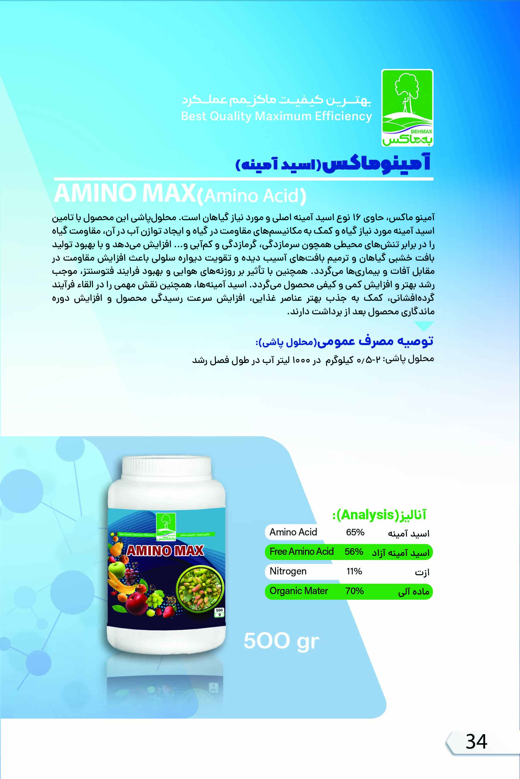 معرفی محصول آمینوماکس، حاوی 16 نوع اسید آمینه اصلی و مورد نیاز گیاه است. محلولپاشی این محصول با تامین اسید آمینه مورد نیاز گیاه و کمک به مکانیسم های مقاومت در گیاه و ایجاد توازن آب در آن، مقاومت گیاه را در مقابل تنش های محیطی همچون سرمازدگی، گرمازدگی، کم آبی و ... را افزایش میدهد همچنین با بهبود تولید بافت خشبی گیاهان و ترمیم بافت های آسیب دیده و تقویت دیواره سلولی باعث افزایش مقاومت در مقابل آفات و بیماریهای میگردد.