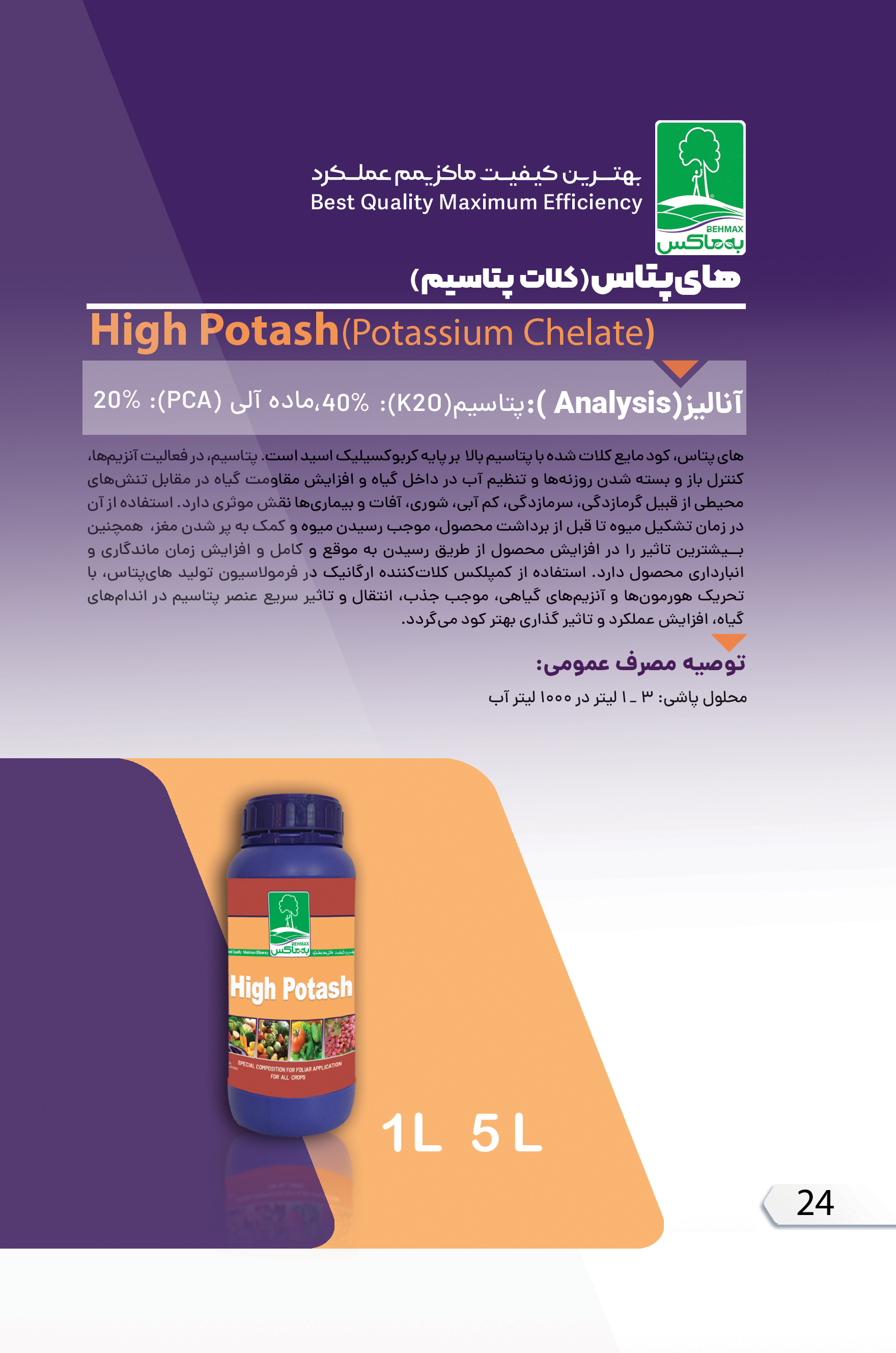 های پتاس، کود مایع پتاسیم بالای کلات شده بر پایه کربوکسیلیک اسید است. پتاسیم، در فعالیت آنزیم ها، کنترل باز و بسته شدن روزنه ها و تنظیم آب در داخل گیاه نقش مهمی دارد. پتاسیم با تعدیل تبخیر و تعرق گیاه، در حفظ آب سلول و کاهش نیاز گیاه به آب و افزایش مقاومت گیاه در مقابل تنش های محیطی از قبیل گرمازدگی، سرمازدگی، کم آبی، شوری، آفات و بیماریها نقش موثری دارد. استفاده از آن در زمان تشکیل میوه تا قبل از برداشت محصول، موجب رسیدن میوه یا پر شدن مغز، و بیشترین تاثیر را در افزایش محصول از طریق رسیدن به موقع و کامل و افزایش زمان ماندگاری و انبارداری محصول دارد. |