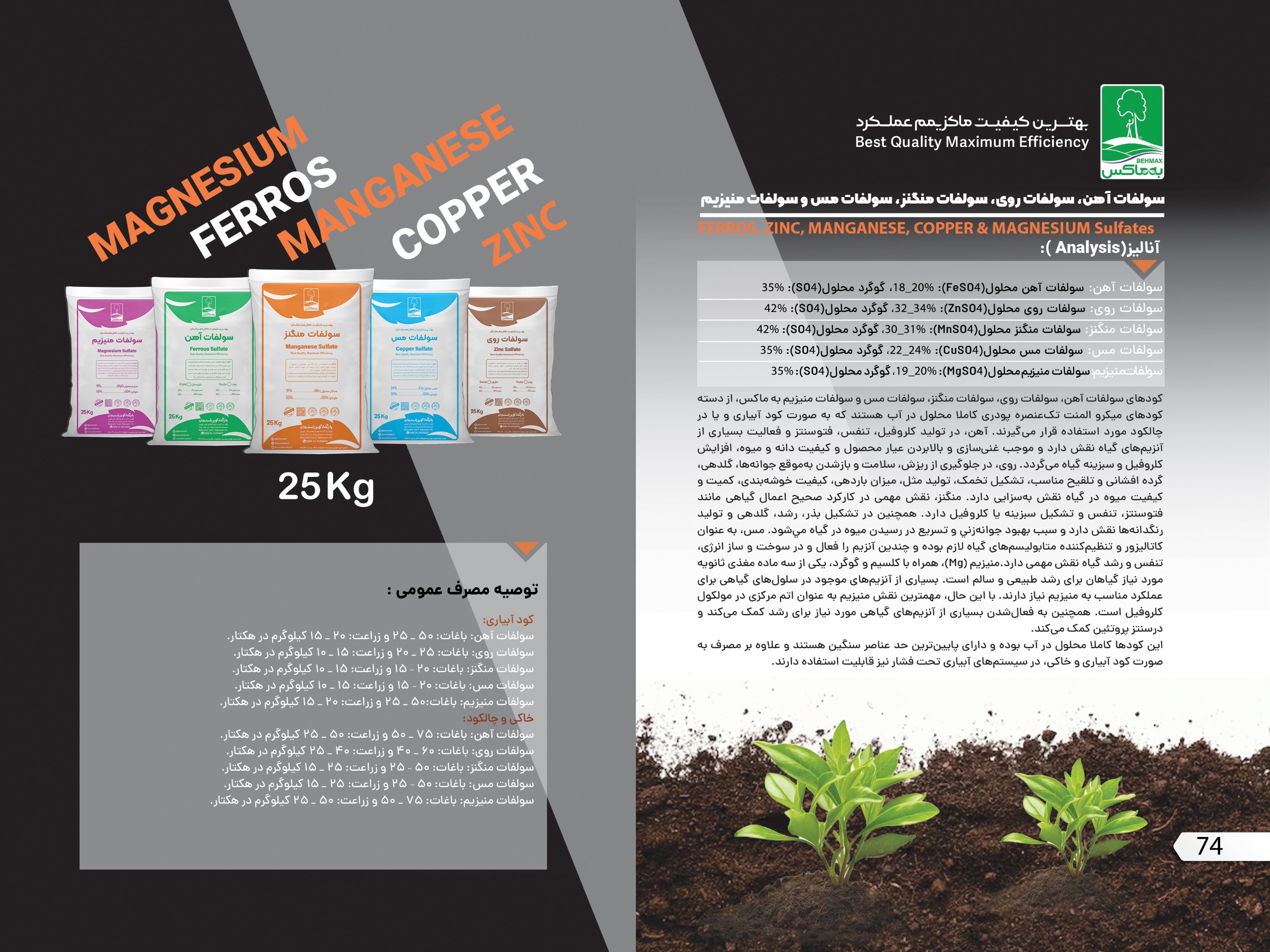 معرفی محصول | کودهای سولفات آهن، سولفات روی، سولفات منگنز و سولفات مس به ماکس، از دسته کودهای میکرو المنت تک عنصره پودری کاملا محلول در آب هستند که به صورت کود آبیاری و مصرف خاکی چالکود مورد استفاده قرار می گیرد. آهن، در تولید کلروفیل، تنفس، فتوسنتز و فعالیت بسیاری از آنزیم های گیاه نقش دارد. موجب غنی سازی و بالابردن عیار محصول و کیفیت دانه و میوه، افزایش کلروفیل و سبزینه گیاه می گردد. روی، در جلوگیری از ریزش، سلامت و باز شدن به موقع جوانه ها، گلدهی، گرده افشانی و تلقیح مناسب، تشکیل تخمک، تولید مثل، میزان باردهی، کیفیت خوشه بندی، کمیت و کیفیت میوه در گیاه نقش به سزایی دارد. منگنز، نقش مهمی در کارکرد صحیح اعمال گیاهی فتوسنتز، تنفس و تشکیل سبزینه یا کلروفيل می شود. همچنین در تشکیل بذر، رشد، گلدهی و تولید رنگدانه ها نقش دارد و سبب بهبود جوانه زني و تسريع در رسيدن ميوه در گیاه مي شود. مس، به عنوان کاتالیزور و تنظیم کننده متابولیسم های گیاه لازم بوده و چندین آنزیم را فعال و در سوخت و ساز انرژی و تنفس و رشد گیاه نقش مهمی دارد. |