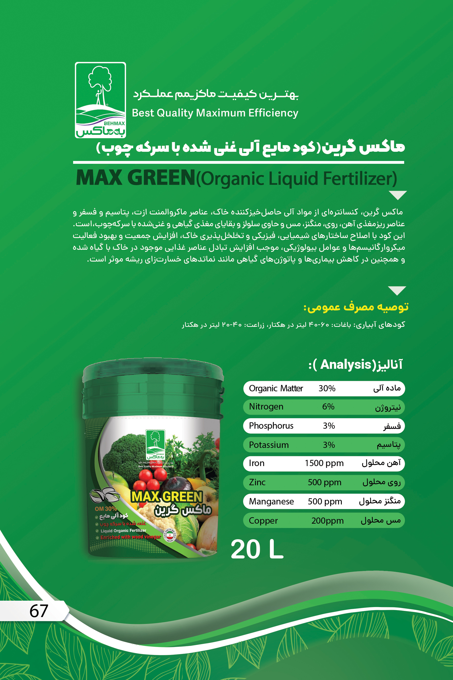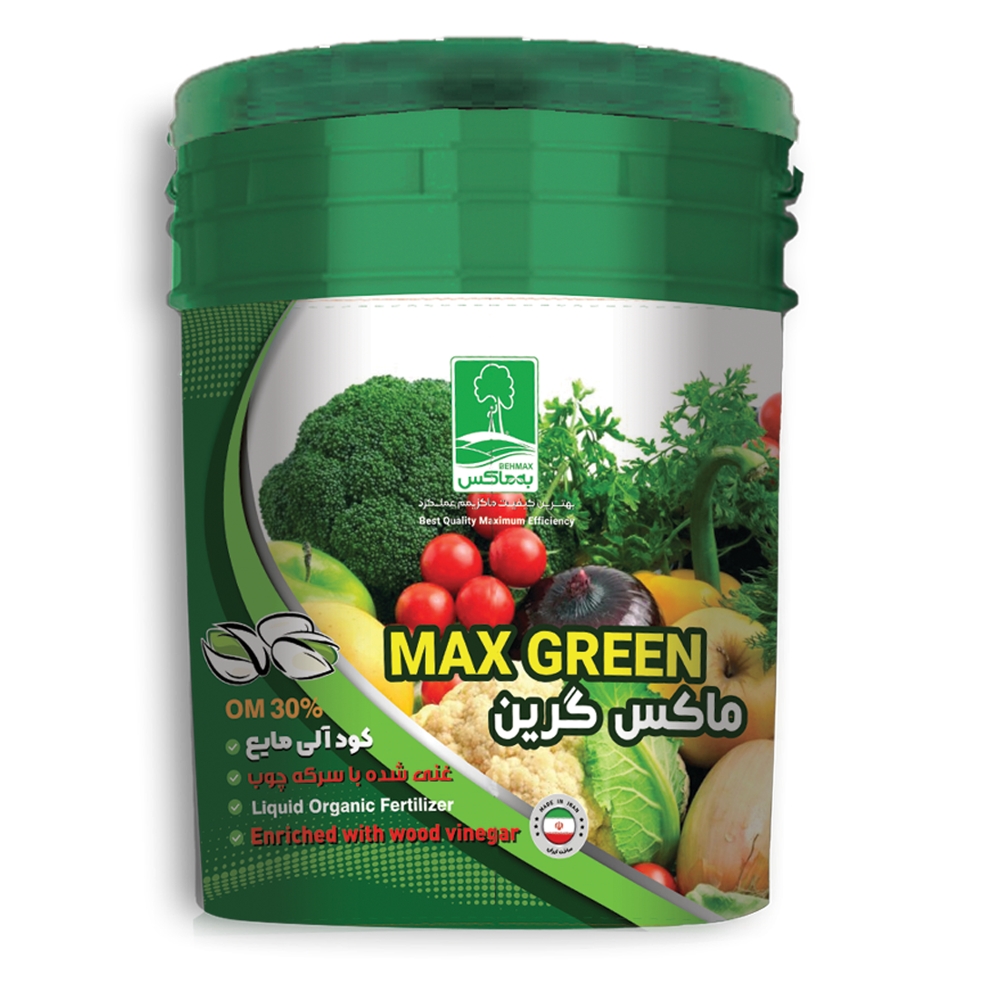 ماکس گرین کنستانتره ای از مواد آلی حاصلخیز کننده خاک، عناصر پرمصرف ازت، پتاسیم و فسفر و عناصر ریز مغذی آهن، روی، منگنز و مس همراه با سلولز و بقایای مغذی گیاهی است که با مقدار مناسبی از سرکه چوب غنی شده است. این کود با اصلاح ساختار شیمیایی، فیزیکی و تخلخل پذیری خاک موجب افزایش جمعیت و بهبود فعالیت میکروارگانیسم ها و عوامل بیولوژیکی، و همچنین افزایش تبادل عناصر غذایی در خاک با گیاه می شود. این ترکیب به دلیل ماهیت سرکه چوب در کاهش بیماری ها و پاتوژن های گیاهی مانند نماتد های خسارت زای ریشه می شود. |
